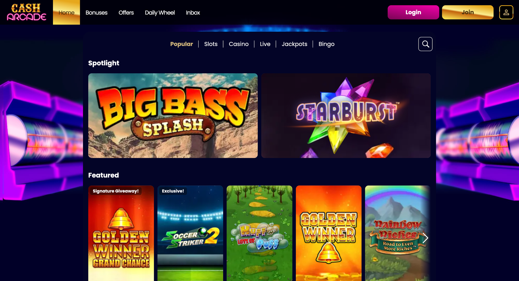 Cash Arcade sits under the Jumpman Gaming network with UKGC licence 39175. It's a lighter, more casual option than some of the deeper casinos on this list, but it does the core job of a deposit by phone bill casino UK well: quick access, simple interface, and a welcome offer built around the Mega Reel spin.