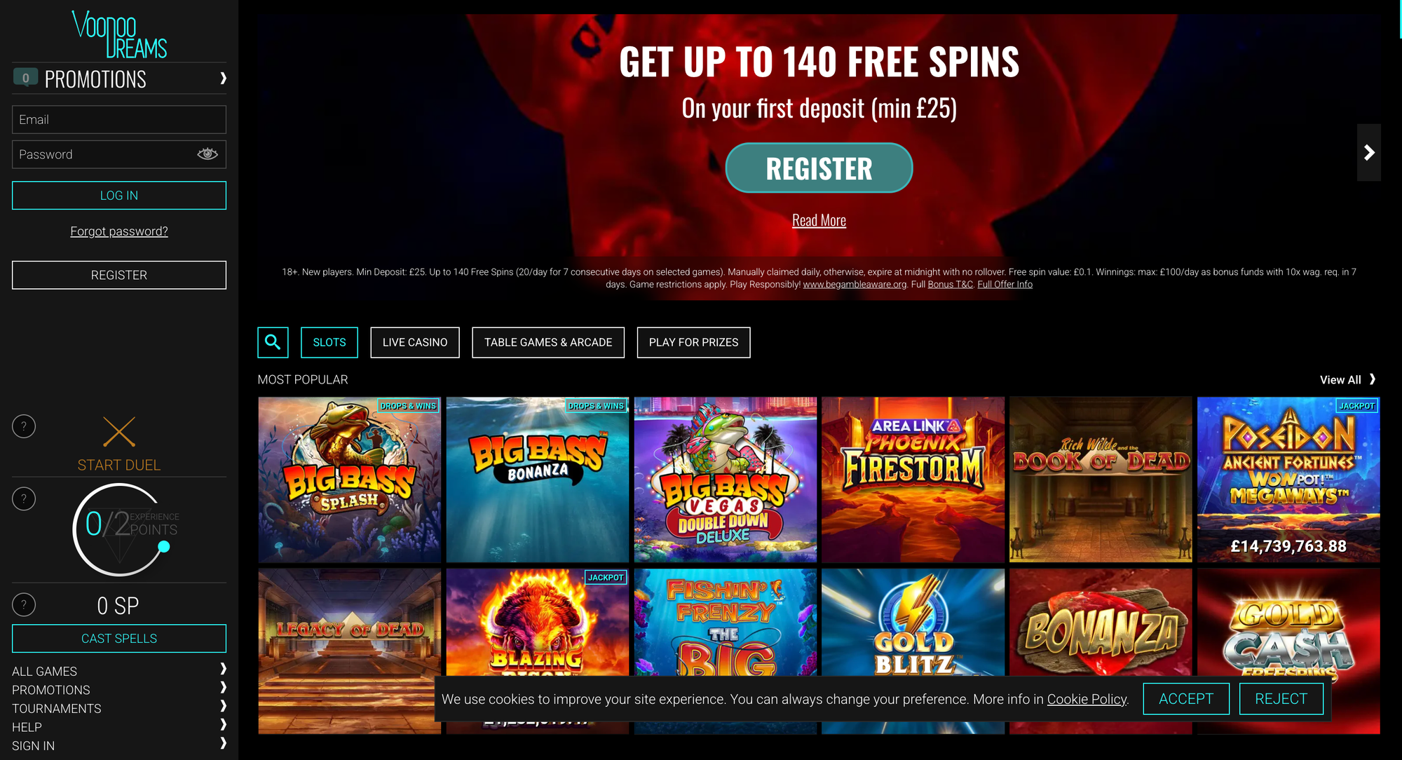 Voodoo Dreams is operated by SuprPlay Limited, the same team behind Duelz, and holds UKGC licence 48695. The dark magic theme is striking and the RPG layer underneath it is real, not cosmetic. You build XP, level up, unlock spells that convert to free spins or real cash. It's one of the most genuinely different experiences in UK mobile billing casinos right now.