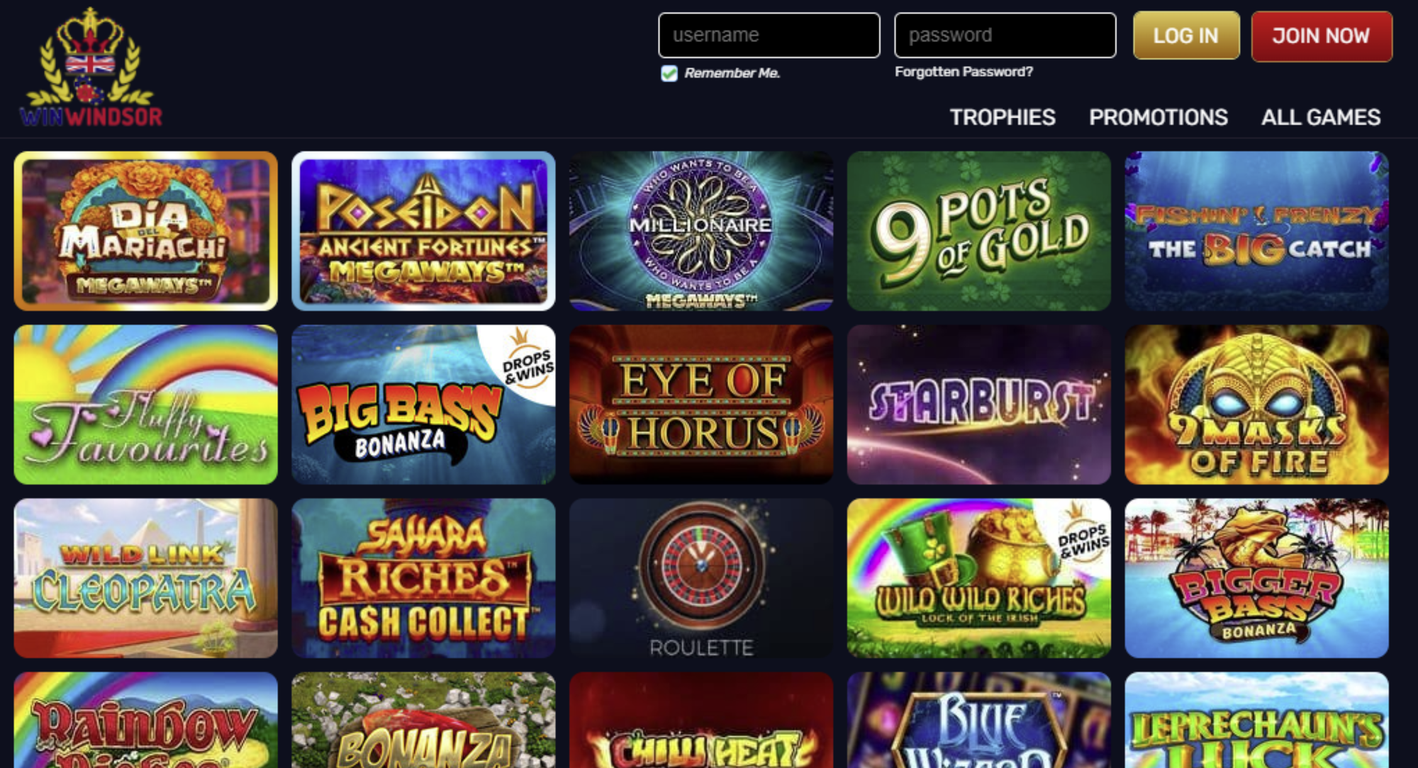 WinWindsor is another Jumpman Gaming product, UKGC licensed (39175). It goes for a premium "Royal" look: black and gold design, sophisticated layout. It's one of the better pay by phone bill UK casinos for players who want a scratchcard-heavy experience alongside traditional slots.
